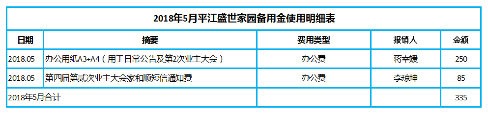 平江小区第四届业委会备用金使用明细表【2018年5月1日至2018年5月31日】