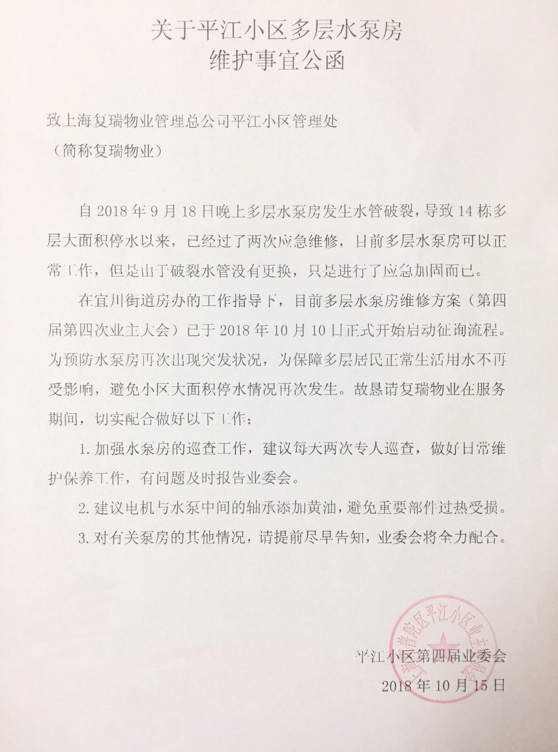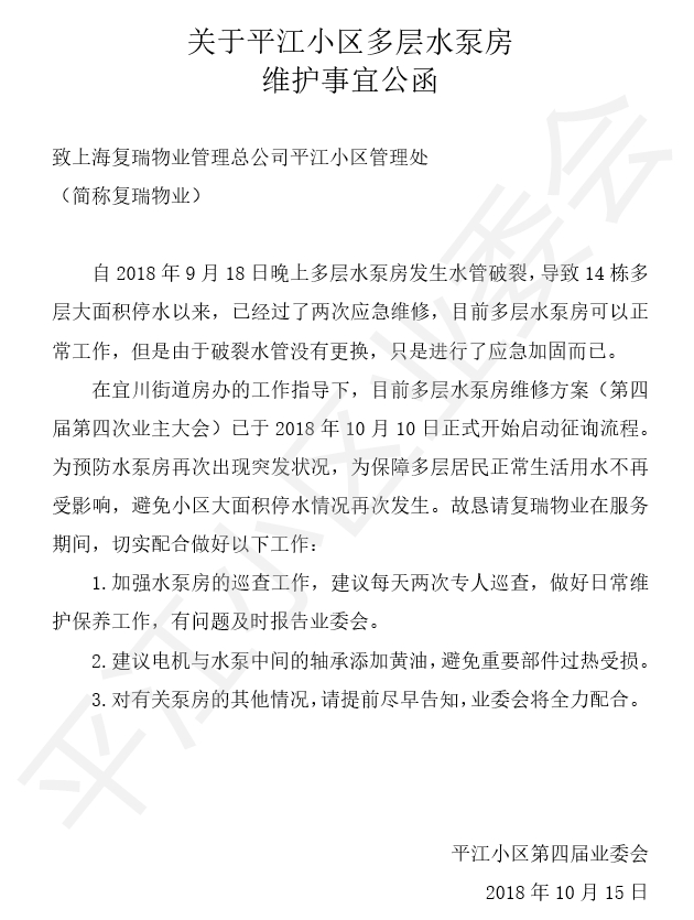 关于平江小区多层水泵房维护保养公函【2018.10.15更新】