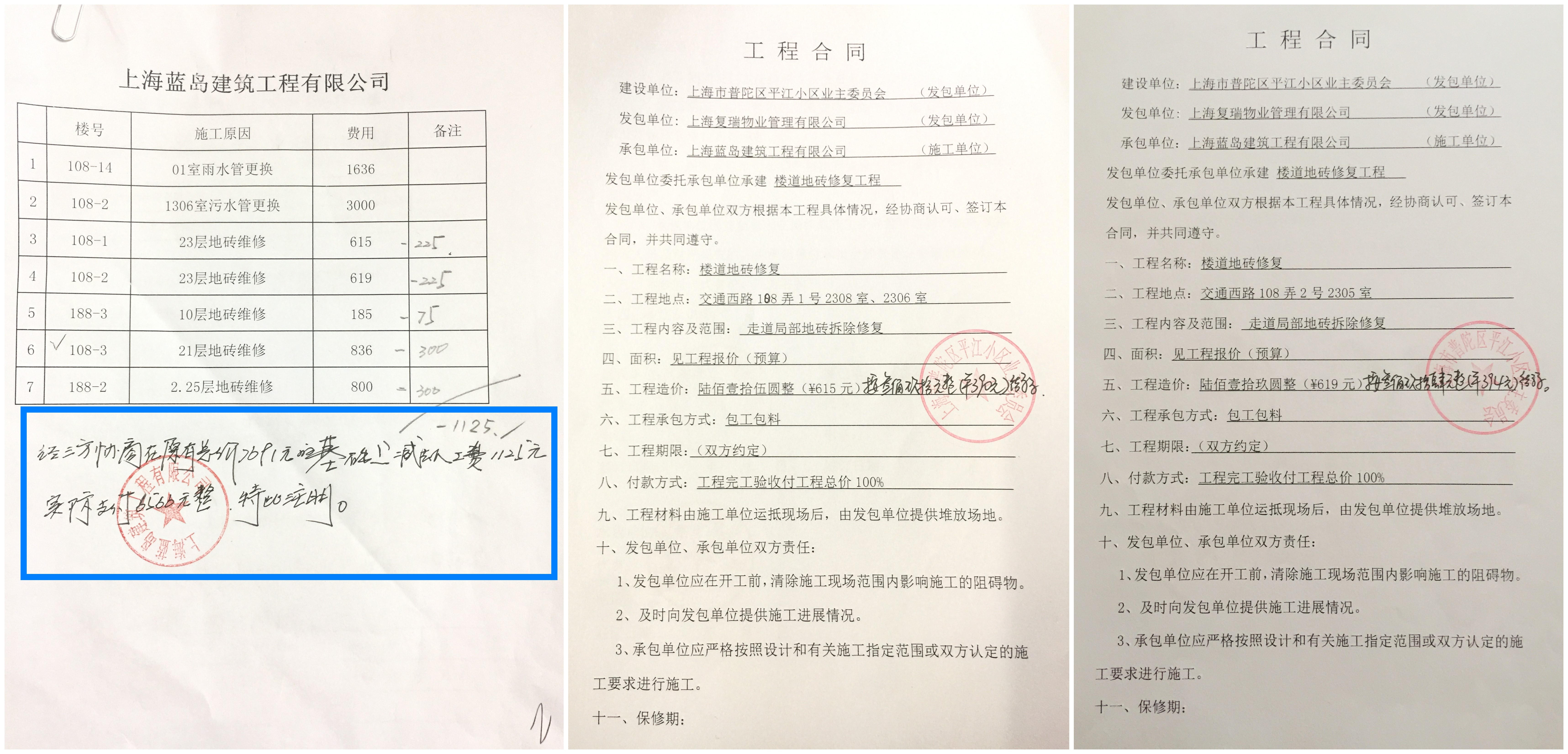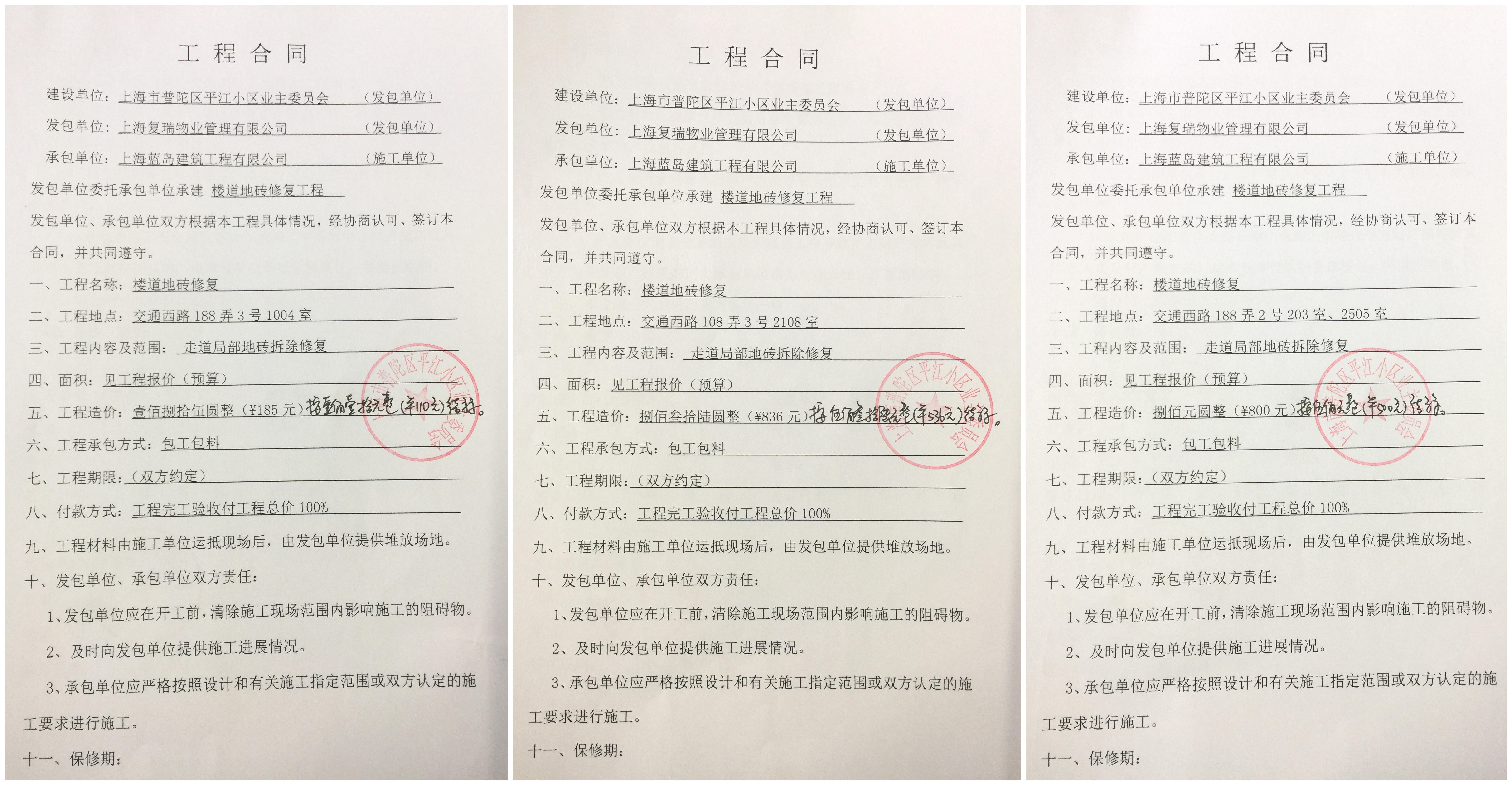 关于2017年3月平江小区108弄和188弄地砖修复结算价公示(上一届业委会任期)