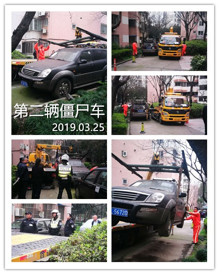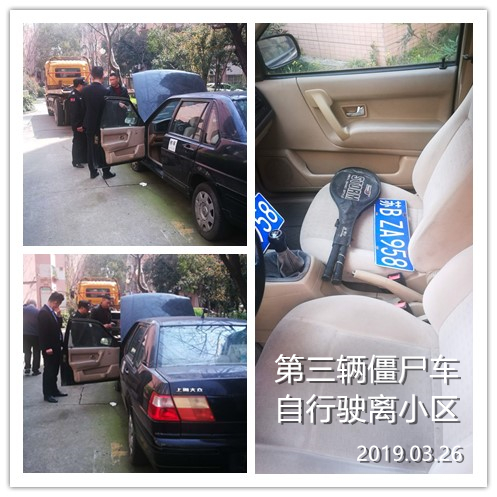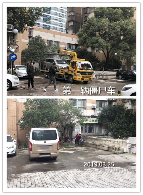 2019年3月25日周一,通过交警,派出所,居委会,业委会和物业的联合行动,正式启动僵尸车清理工作。