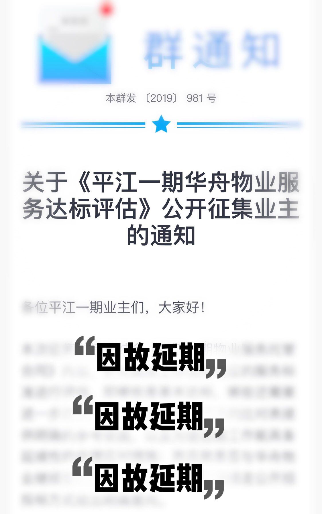 因故延期:关于《平江一期华舟物业服务达标评估》公开征集业主