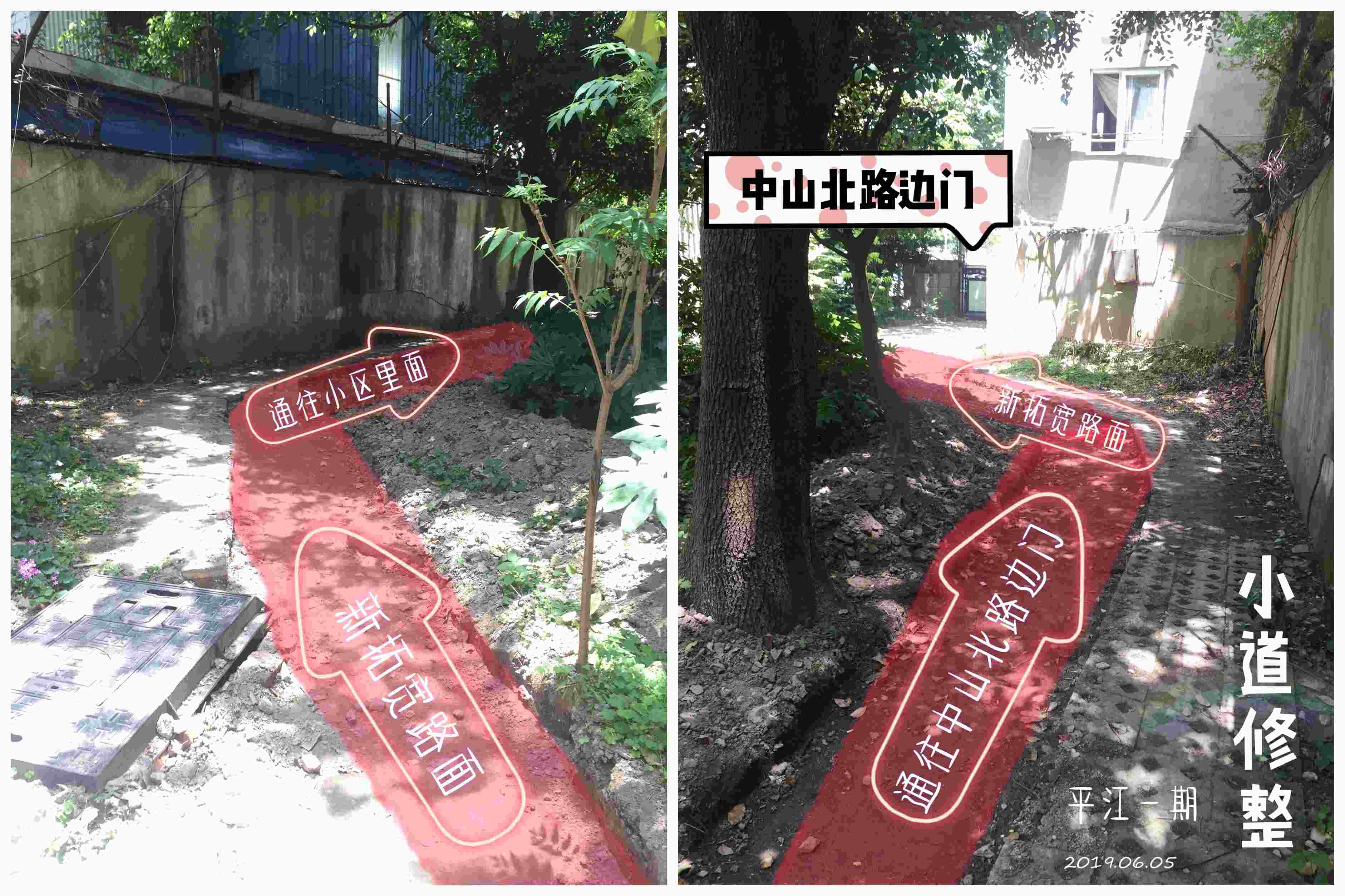 1、中山北路边门附近的小道修整(正在进行)。